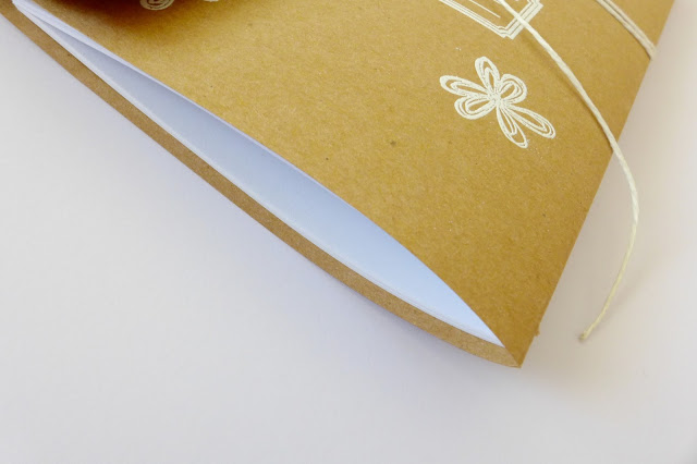 Keďže tento papier je dosť pevný, dá sa z neho spraviť aj jednoduchý šitý notes. Ja som svoj opäť ozdobila iba bielym embossingom a ľanovým špagátom: